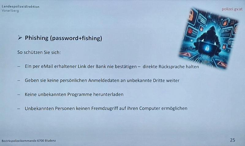 Im gut besetzten Sitzungszimmer des Rathaus Bludenz entführte uns Andreas Gantner in die Welt der Cyberkriminalität und die damit verbundenen Gefahren im Internet. In seinem interessanten Referat gab er den interessierten Zuhörern anhand einiger Beispiele Tipps, wie man sich vor eventuellen Gefahren schützen bzw. wo man sich Hilfe holen kann.