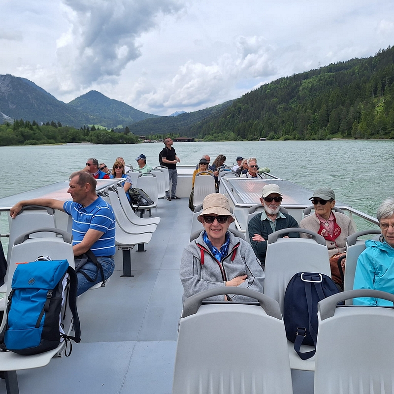 Nach der Fahrt über den Fernpass wurden wir von der bezaubernden Landschaft um den Plansee überrascht. Am Ufer des smaragd-schimmernden Wassers ging es sanft zum Heiterwangersee. Während einer Rast am Ufer wurden die Nichtwanderer freudig im vorbeifahrenden Schiff begrüßt.